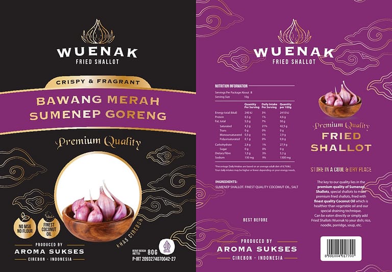 | 1 | FRIED SHALLOT 80 G | SMALL POUCH | 24 | 33 x 28 x 15 | Sumenep Shallot, Salt, Finest quality Coconut Oil |